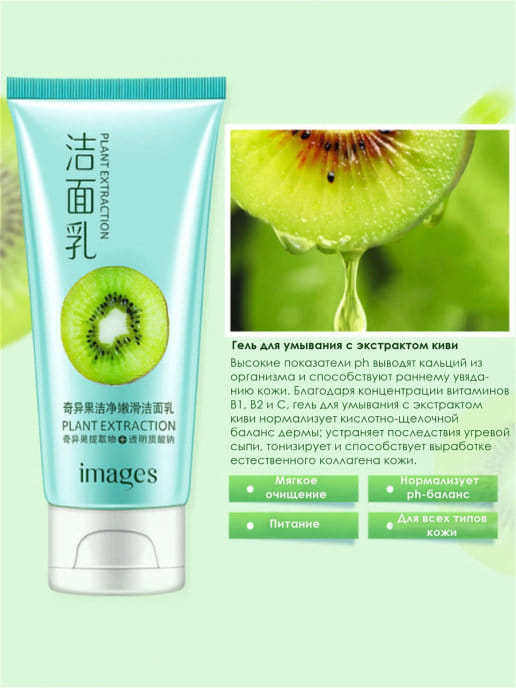 Лёгкий крем для умывания с экстрактом киви глубоко очищает, тонизирует и освежает вашу кожу.