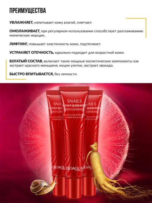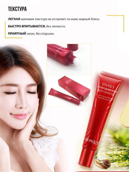 Омолаживающий крем для ухода за кожей вокруг глаз Биоаква содержит муцин улитки и корень красного женьшеня. Он не только интенсивно увлажняет и питает кожу, но и защищает ее от негативных внешних факторов: ультрафиолета, ветра, холода, сухого воздуха. Высокая биологическая активность компонентов крема позволяет ему показывать отличные результаты уже после первого применения.