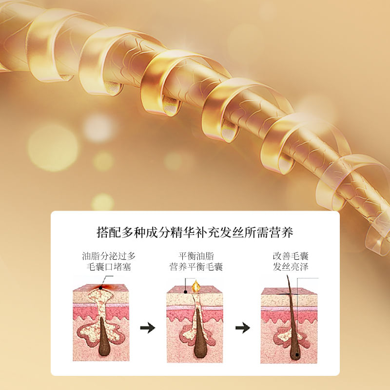 Способствует лечению волос и в особенности волосяных луковиц, их интенсивной регенерации, стимулирует рост волос и оздоровление структуры волоса изнутри, восстанавливает кожу головы на уровне гиподермы.