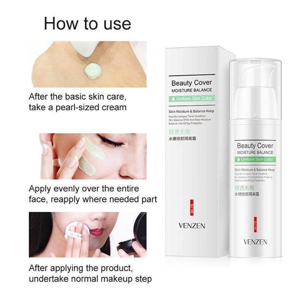 Защитная база под макияж Venzen Beauty Cover позволяет моментально устранить разнообразные покраснения кожи. С ее помощью отлично маскируются или же делаются не такими заметными небольшие прыщи, сосудистая сетка. База под макияж способна даже убрать ту красноту, что возникает после долгого пребывания на солнце.